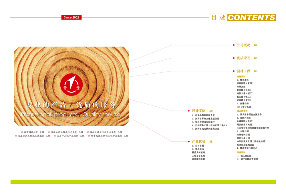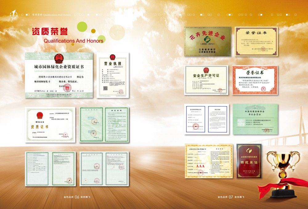 公司以園林綠化工程、市政公用工程、古建筑施工及景觀設(shè)計為主要業(yè)務(wù)的綜合性公司。并具備園林綠化一級、市政公用二級、鋼結(jié)構(gòu)三級、古建筑三級、房屋建筑工程施工總承包三級和城市及道路照明工程專業(yè)承包三級資質(zhì)企業(yè)。公司組織機構(gòu)健全、管理制度完善,具備獨特的經(jīng)營理念和服務(wù)精神。公司技術(shù)力量雄厚,機械設(shè)備齊全。公司已取得AAA級資信等級、重合同守信用企業(yè),通過ISO9001國際認證體系并取得證書。目前我公司自主培育苗圃1000余畝,常年生產(chǎn)各種常綠、落葉喬木,花灌木、各類盆景、草坪、地被等植物百余種,年產(chǎn)各類苗木250萬株,盆花130萬盆,暢銷省內(nèi)外各地。