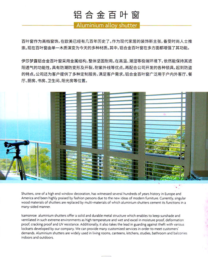 常州伊莎夢露百葉窗有限公司成立于2010年,是一家專業(yè)從事高端鋁臺金百葉窗以及百葉窗五金配件研發(fā)、生產(chǎn)、銷售和服務(wù)的現(xiàn)代化企業(yè)。公司本著“誠信為本,客戶至上”的原則。產(chǎn)品遠(yuǎn)銷大洋洲、歐洲、美洲等多個(gè)國家,并得到客戶的一致認(rèn)可。 目前公司具有比較先進(jìn)的生產(chǎn)設(shè)備及檢測手段和完善的質(zhì)量保證體系和管理制度,在這基礎(chǔ)上公司每年加大研發(fā)投入,陸續(xù)獲得十多項(xiàng)專利。今后公司還將繼續(xù)堅(jiān)持品牌發(fā)展戰(zhàn)略,提升市場能力,為消費(fèi)者提供更加優(yōu)質(zhì)的產(chǎn)品和服務(wù)。地址:江蘇省常州市經(jīng)濟(jì)開發(fā)區(qū)橫山橋鎮(zhèn)朝陽村大橋工業(yè)園509號電話:0519-88763142 傳真:0519-88762898網(wǎng)址:www.chinaismr.cn郵箱:Isamonroe-liu@outlook.com 48980807@qq.com