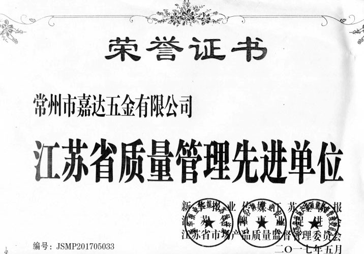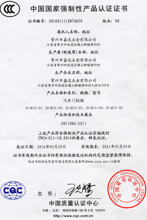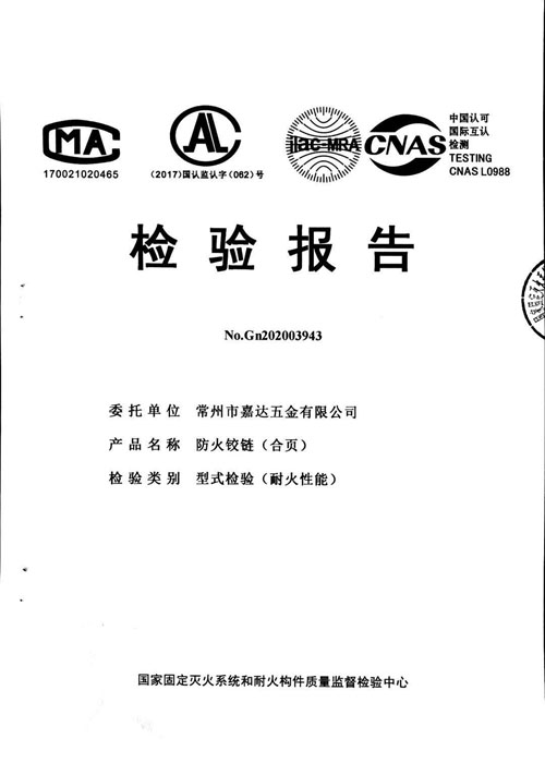 常州市嘉達五金有限公司是專業(yè)生產(chǎn)不銹鋼防火、防盜合頁、銅手拉門、銅門鉸鏈、銅花和各種不銹鋼暗插銷的企業(yè).最近又成功開發(fā)承重鉸鏈以及調(diào)節(jié)門縫可調(diào)式鉸鏈.同時引進澳大利亞技術(shù)開發(fā)各種鋁合金透氣百頁窗,遠銷歐美市場. 我司占地面積25000平方米,建筑面積12000平方米;固定資產(chǎn)1200萬元,公司設(shè)備齊全,設(shè)計獨特,檢測一流,產(chǎn)品適用于高級防火門以及現(xiàn)代高層居室、艦船門的配套,也適應(yīng)于一般居民.產(chǎn)品經(jīng)"天津國家固定滅火系列和耐火構(gòu)件質(zhì)量監(jiān)督檢驗中心"檢驗合格. 公司重視產(chǎn)品質(zhì)量,重視產(chǎn)品開發(fā)創(chuàng)新.目前已建立完整的質(zhì)量管理體系:通過ISO9001:2000質(zhì)量認(rèn)證體系和中國強制認(rèn)證3C認(rèn)證.產(chǎn)品曾獲國家知識產(chǎn)權(quán)局"中國專利技術(shù)博覽會"金獎、獲得"企業(yè)資信等級AAA級"、"信用(合同)AAA級企業(yè)"、"中國檢驗協(xié)會會員"、"中國電器照明協(xié)會委員"、"中國工商協(xié)會委員"、"首批國家質(zhì)量服務(wù)信得過單位"、"常州市文明單位"及"武進區(qū)文明單位"的稱號. 公司的經(jīng)營宗旨是"以顧客為中心、以質(zhì)量為市場、以創(chuàng)新求發(fā)展、以管理求效益". 公司將一如既往,以一流的產(chǎn)品質(zhì)量,誠心周到的服務(wù)使顧客滿意,以更好的服務(wù)于客戶.