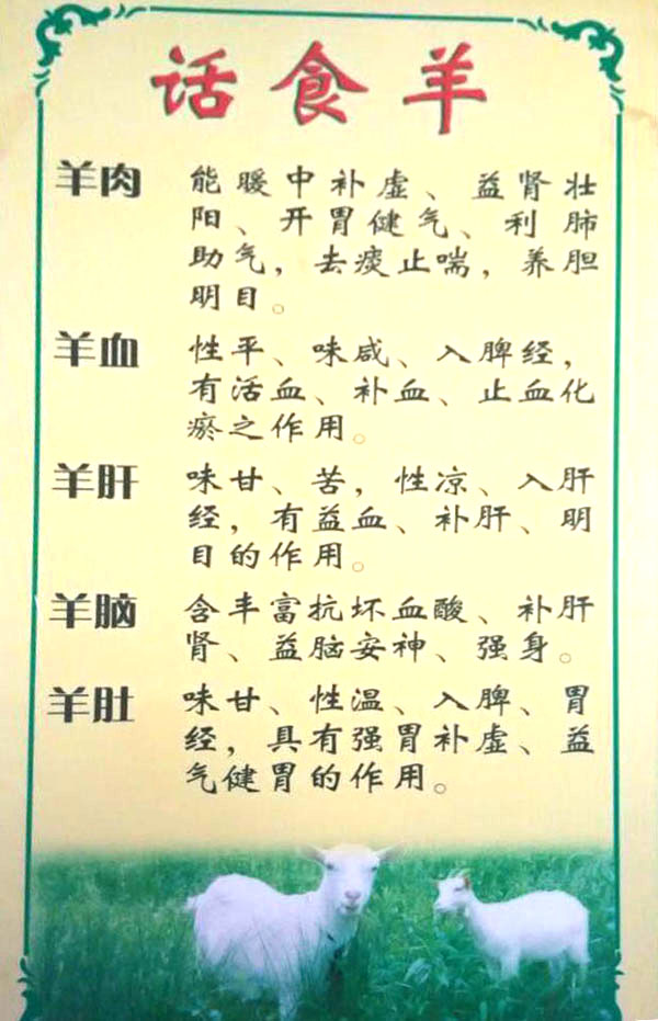 羊肉性溫熱、補氣滋陽、暖中補氣、開胃健脾、還可以去濕氣避寒冷,暖胃寒、養(yǎng)吃百草、養(yǎng)根據(jù)自身生理需要選擇草木、固羊有“百藥之庫”之稱。古人云:多吃羊肉、健康長壽。